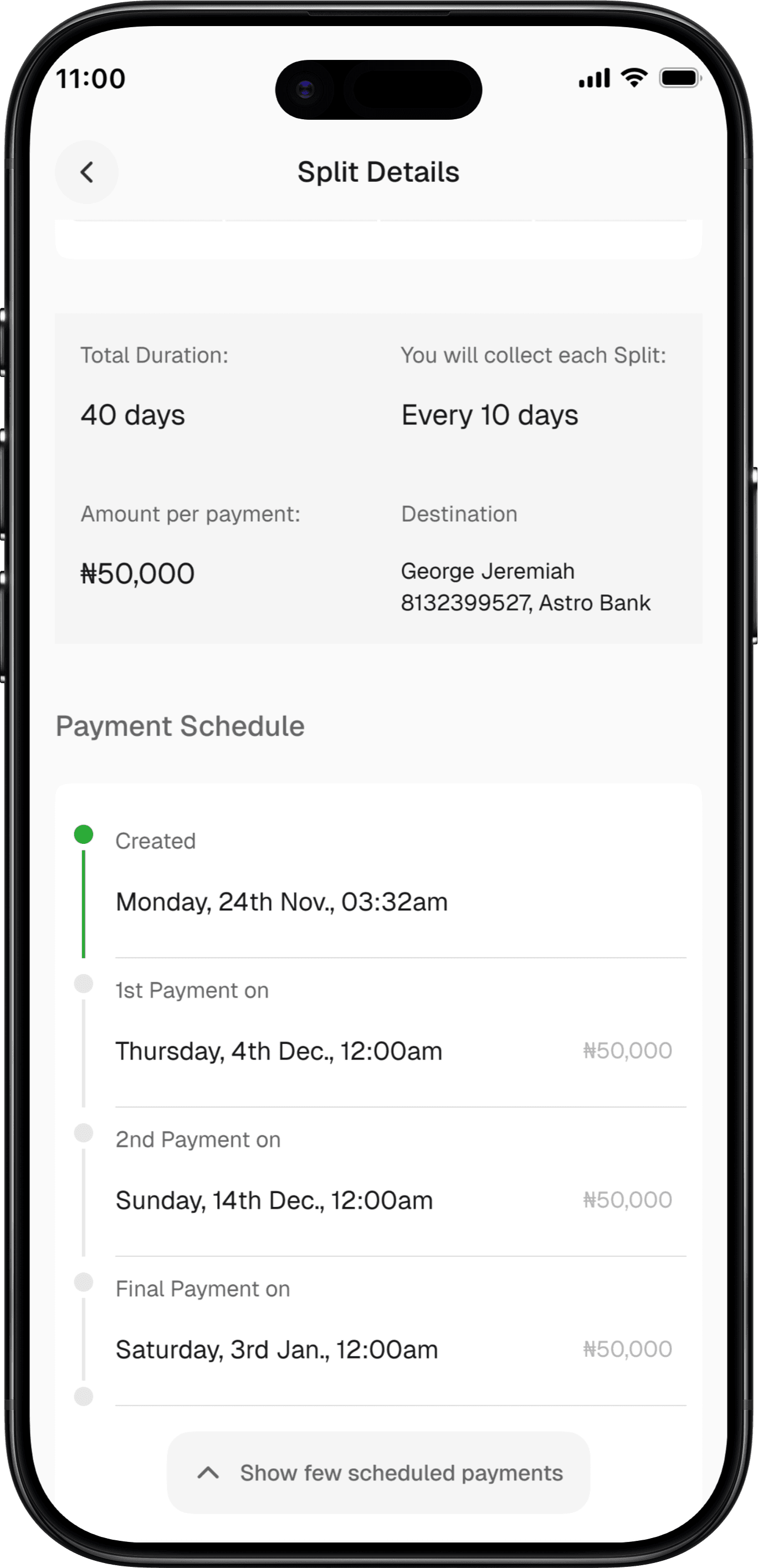 Know exactly when every split will hit your account. Spleeet shows you a clear schedule from day one to the last payment—so you're never guessing what's coming next.